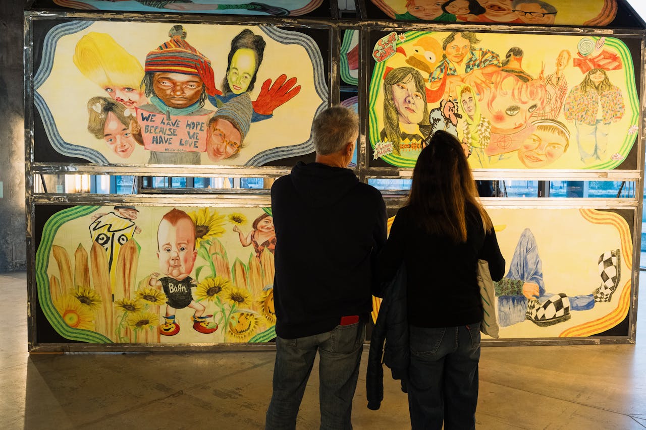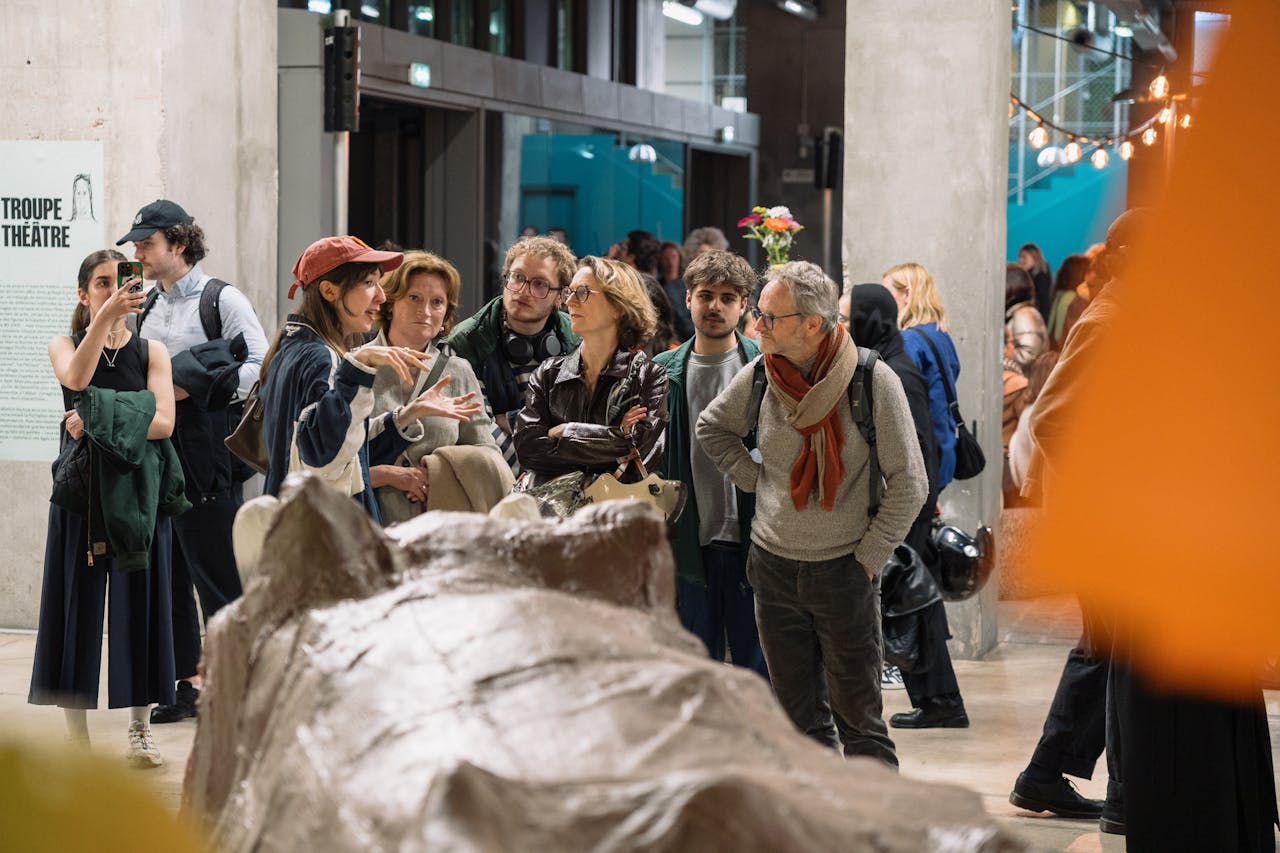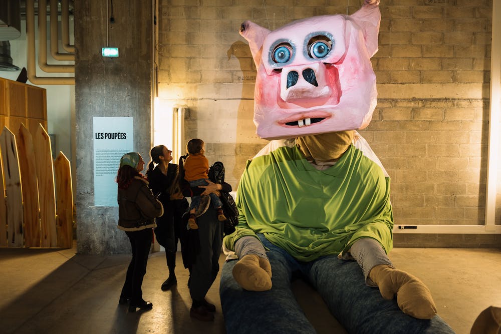 Pour son exposition-résidence, Valentine Gardiennet transforme les Magasins Généraux en un village imaginaire. Des poupées géantes qui semblent prendre vie, une maison dont les murs et le toit sont faits de dessins, une troupe de théâtre en carton-pâte, un moulin et quelques fantômes entourent un immense lit. Cet univers dans lequel Valentine Gardiennet nous invite est avant tout une ode au collectif et à la nécessité d’être plusieurs pour évoluer dans l’art et la vie.